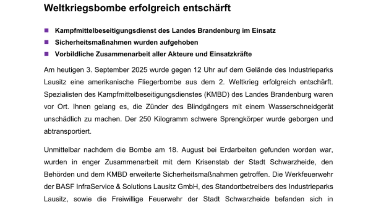 Am heutigen 3. September 2025 wurde gegen 12 Uhr auf dem Gelände des Industrieparks Lausitz eine amerikanische Fliegerbombe aus dem 2. Weltkrieg erfolgreich entschärft. Spezialisten des Kampfmittelbeseitigungsdienstes (KMBD) des Landes Brandenburg waren vor Ort. Ihnen gelang es, die Zünder des Blindgängers mit einem Wasserschneidgerät unschädlich zu machen. Der 250 Kilogramm schwere Sprengkörper wurde geborgen und abtransportiert.