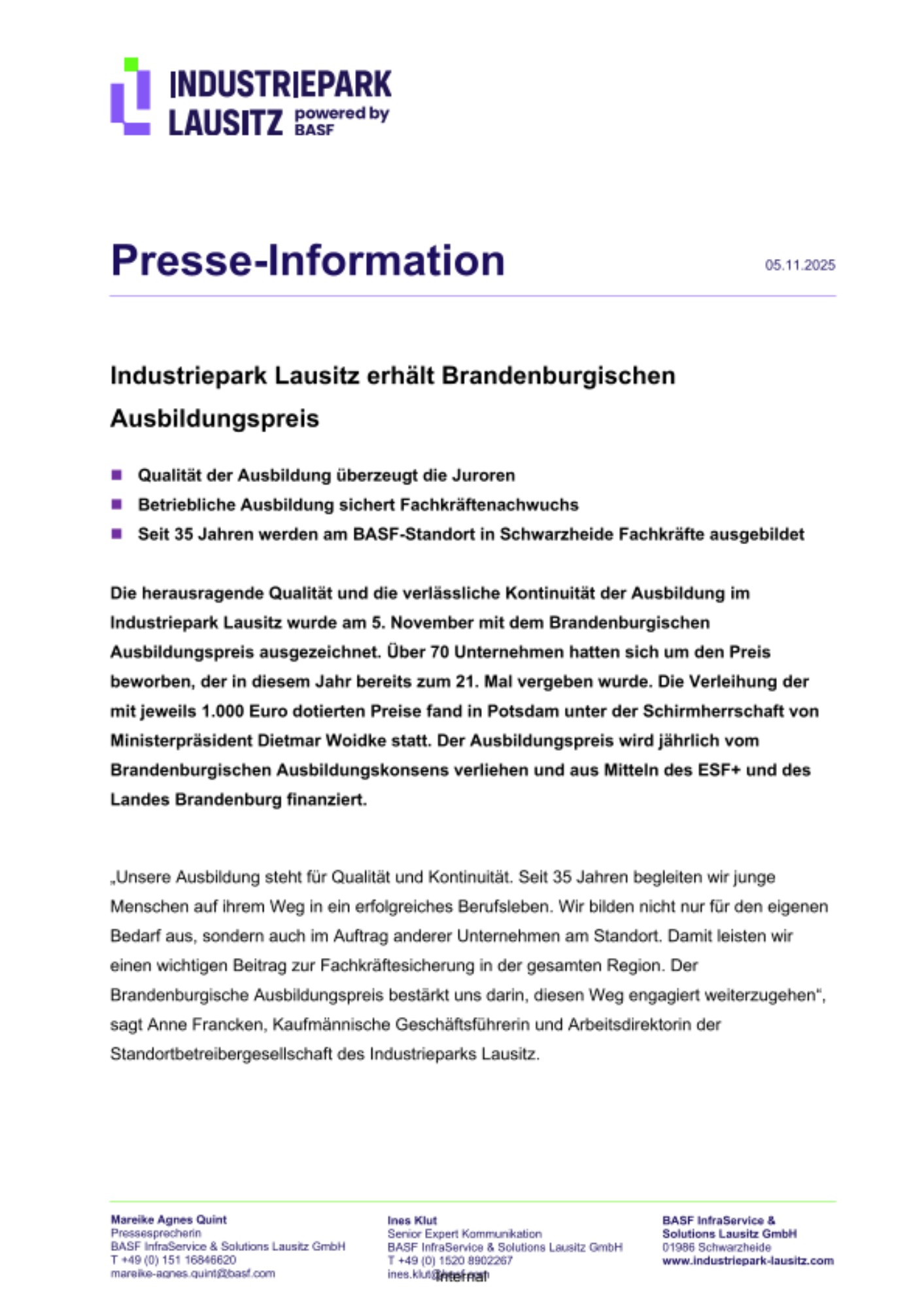 Die herausragende Qualität und die verlässliche Kontinuität der Ausbildung im Industriepark Lausitz wurde am 5. November mit dem Brandenburgischen Ausbildungspreis ausgezeichnet. Über 70 Unternehmen hatten sich um den Preis beworben, der in diesem Jahr bereits zum 21. Mal vergeben wurde. Die Verleihung der mit jeweils 1.000 Euro dotierten Preise fand in Potsdam unter der Schirmherrschaft von Ministerpräsident Dietmar Woidke statt. Der Ausbildungspreis wird jährlich vom Brandenburgischen Ausbildungskonsens verliehen und aus Mitteln des ESF+ und des Landes Brandenburg finanziert.