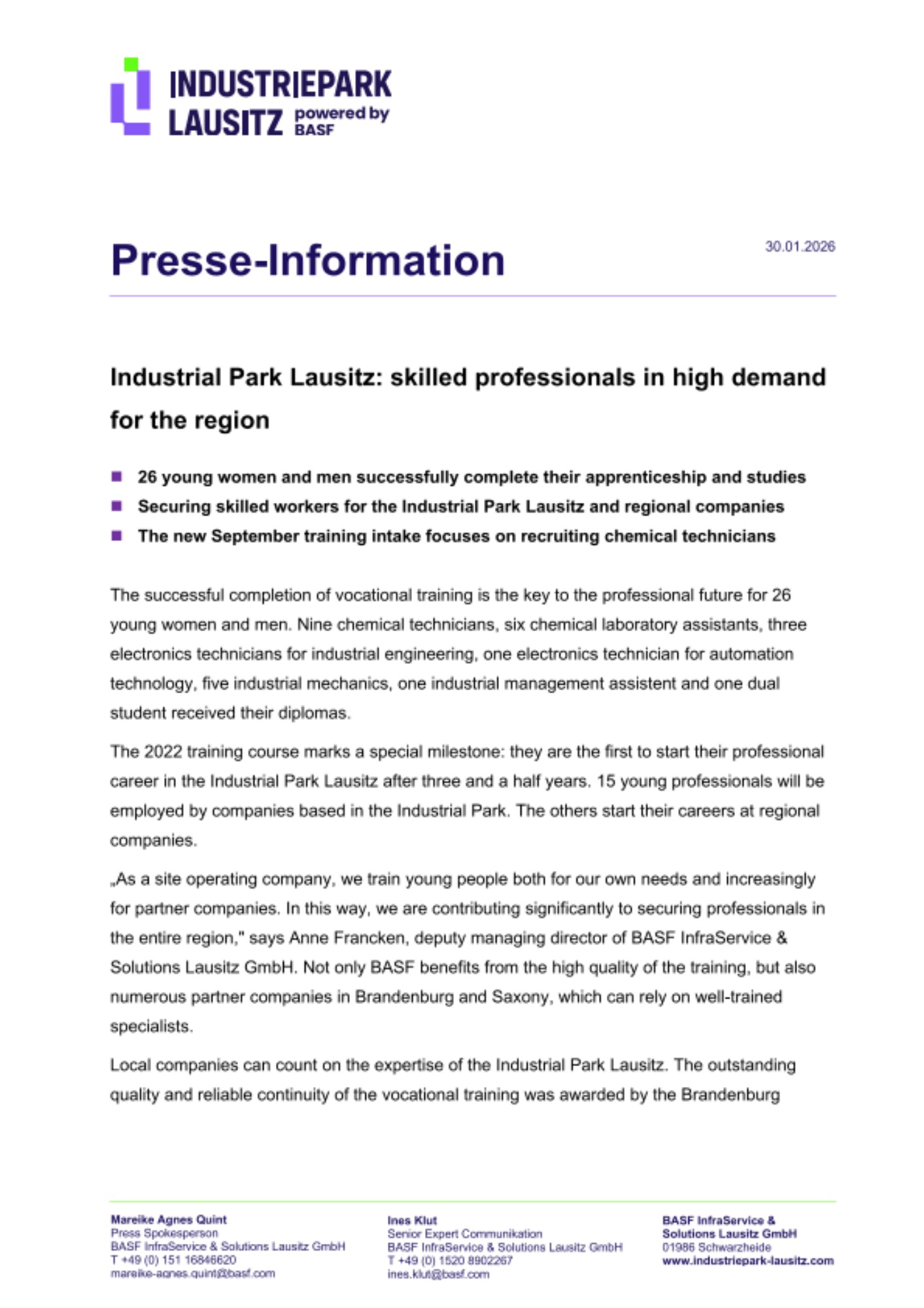 Local companies can count on the expertise of the Industrial Park Lausitz. The outstanding quality and reliable continuity of the vocational training was awarded by the Brandenburg government at the end of last year. In addition, BASF graduates have regularly been among the best in recent years.